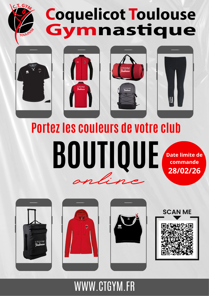 L'équipe du CTGYM est heureuse de vous annoncer que la boutique en ligne d'articles aux couleurs du Club propose une ⚡ouverture éclair ⚡du 23 au 28 février !!